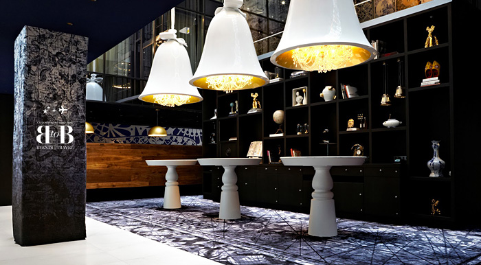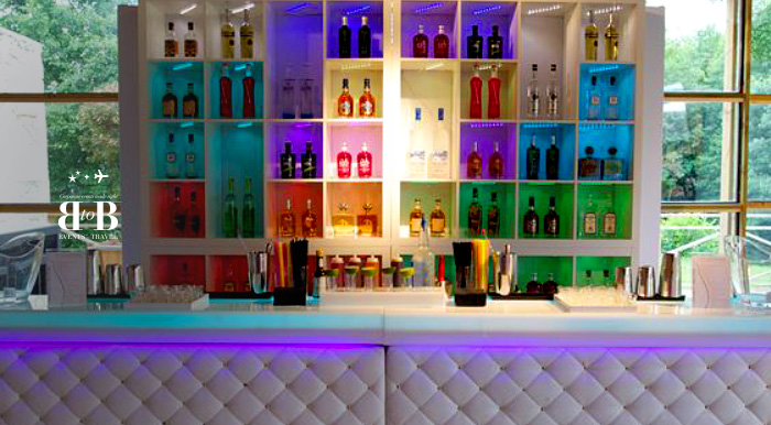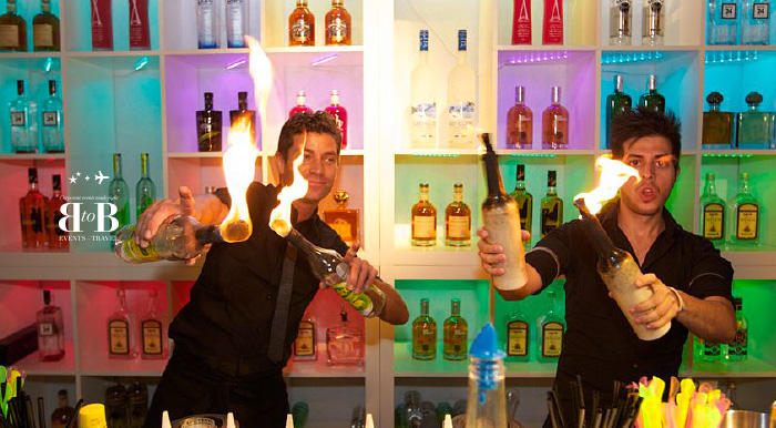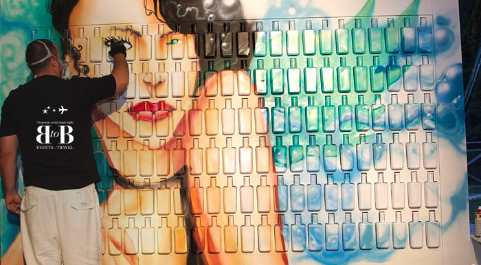 Scénographie, mise en valeur des bouteilles, barmen jongleur, customisation par artiste sur mur de bouteilles…